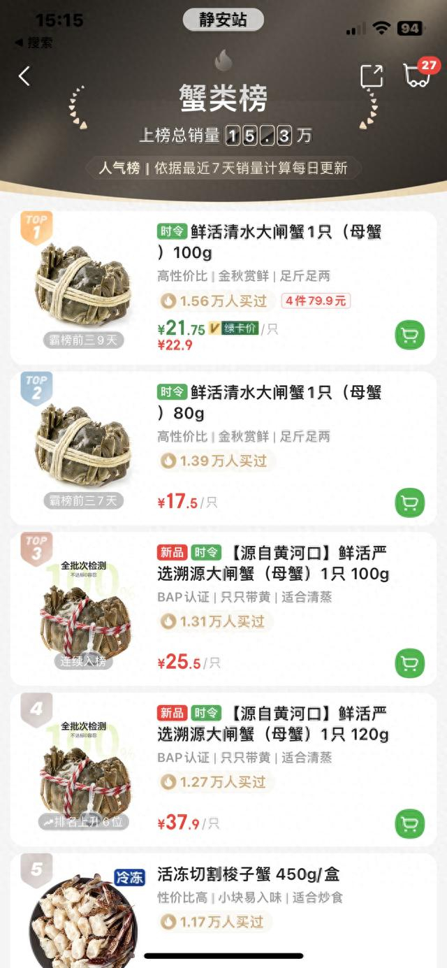 而在各电商平台上,大闸蟹市场已经预热了起来,如盒马鲜生已上架多款大闸蟹(母蟹),叮咚买菜、美团买菜已上架黄河口大闸蟹、新疆天山雪蟹,预计中秋节前大闸蟹整体销量同比去年同期能高出20%。