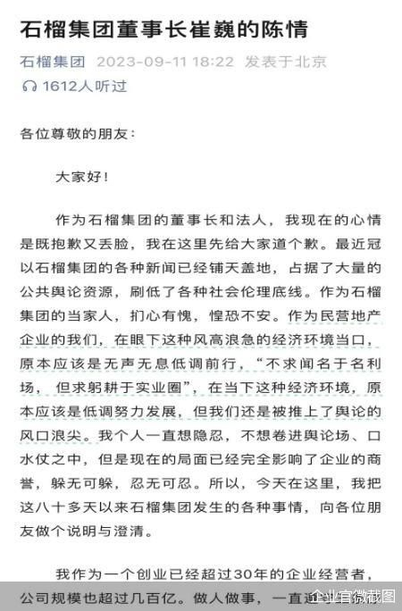 作为公司创始人,崔巍对石榴集团的现状非常担忧,其在推文中表示,“将逐一拜访各大金融机构,让正常的贷款可以延续,不要让企业死于一场无妄的舆情之灾”。