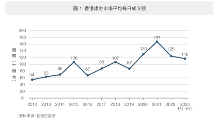 最近两年来,港股流动性持续下降。港交所数据显示,2021年的平均每日成交金额为1667亿港元,而2023年前7个月的港股的平均日成交金额仅为1136亿港元。