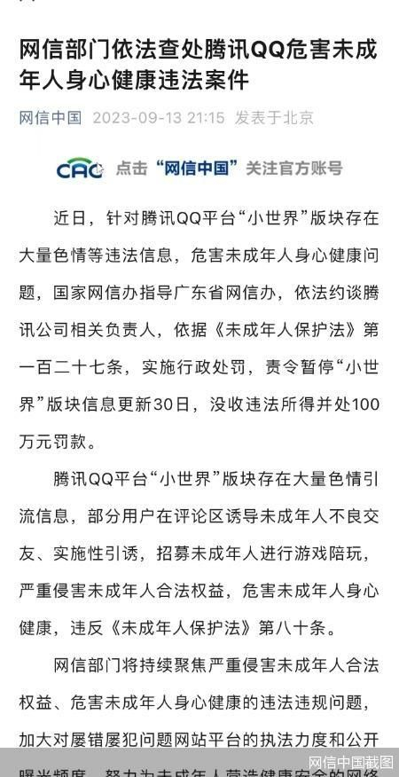 北京商报讯(记者 卢扬 韩昕媛)9月13日,网信中国官微发布消息称,针对腾讯QQ平台“小世界”版块存在大量色情等违法信息,危害未成年人身心健康问题,国家网信办指导广东省网信办,依法约谈腾讯公司相关负责人,依据《未成年人保护法》第一百二十七条,实施行政处罚,责令暂停“小世界”版块信息更新30日,没收违法所得并处100万元罚款。