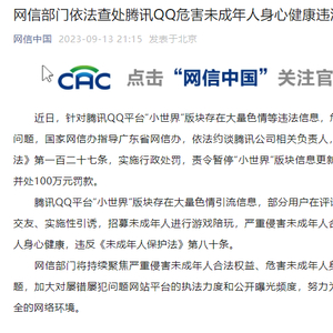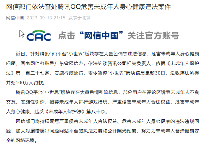 据“网信中国”微信公众号消息,近日,针对腾讯QQ平台“小世界”版块存在大量色情等违法信息,危害未成年人身心健康问题,国家网信办指导广东省网信办,依法约谈腾讯公司相关负责人,依据《未成年人保护法》第一百二十七条,实施行政处罚,责令暂停“小世界”版块信息更新30日,没收违法所得并处100万元罚款。