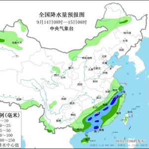 9月14日08时至15日08时,江南中东部和南部、华南大部等地部分地区有中到大雨,其中,湖南南部、江西中部、浙江西部、广西东北部、广东中西部等地部分地区有暴雨或大暴雨。新疆南疆盆地东部、内蒙古中部等地部分地区有4~6级风。