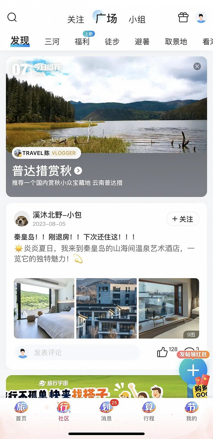 在广场里,顶部有徒步、避暑、取景地、看海、酒店等分类,下方则是达人、博主的旅游内容发布,涉及酒店推荐、旅游日记等,帮助用户发现更广泛的兴趣。