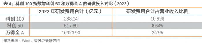 科创100指数研发投入占比水平高。2022年,科创100指数成份股的研发投入总计288.14亿元,占营业收入的10.62%,高于科创50指数(8.64%)、万得全A指数(2.29%)。