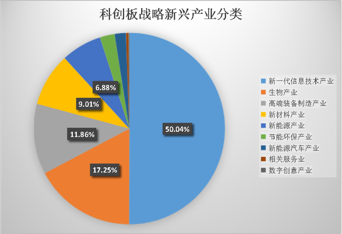 按照《战略新兴产业分类(2018)》(行业分类法更加适合用于科技创新类企业的业务)行业分类,市值上看,以信息技术、生物医药、高端制造等为代表的“硬科技”市值合计占比79.16%。