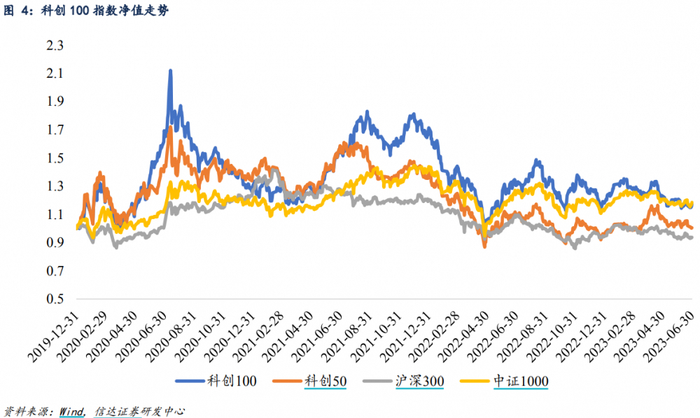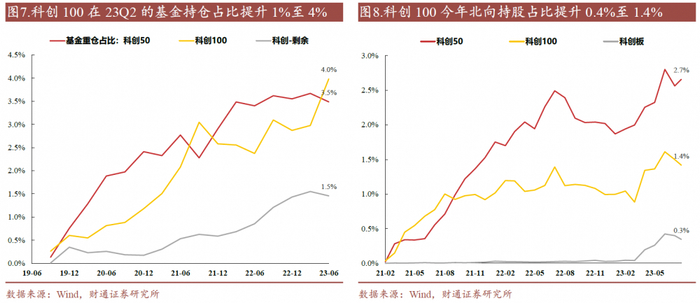 基金重仓:科创100的相关标的在开板以来持续被基金所关注,其中2023年二季度在加速增配,重仓占比提升达1.0%。截至2023年6月末,科创100的重仓占比达4.0%,已超过科创50;