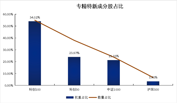 在科创100指数的成份股中,有55家国家级“专精特新”企业,数量占比55%,权重占比为54.02%,含量大幅高于科创50、沪深300、中证1000等市场主流宽基指数。