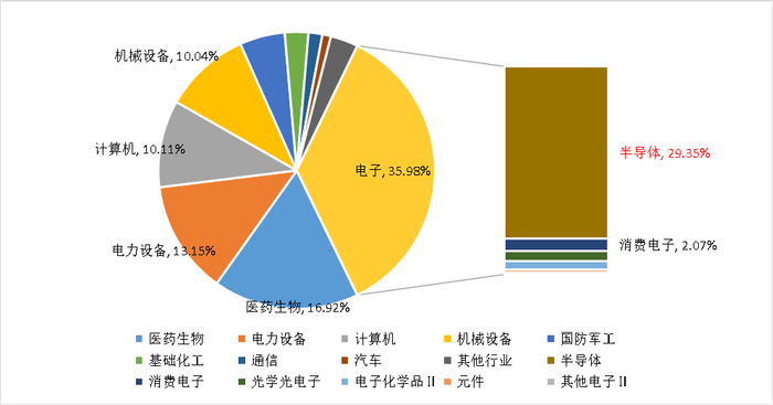 2、行业分布:聚焦硬科技,半导体含量近30%