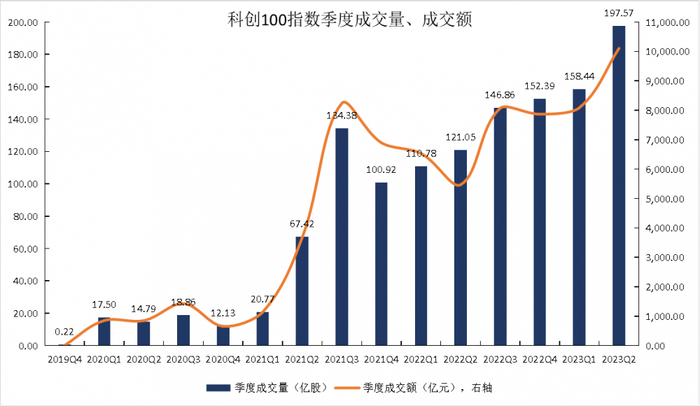 2023年以来,指数交投活跃度较2022年有大幅提升。2023年上半年指数成交量、成交额创季度新高。