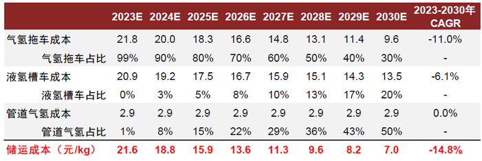 小结:储运为氢气降本较大环节,预计至2030年储运成本可降至7.0元/kg