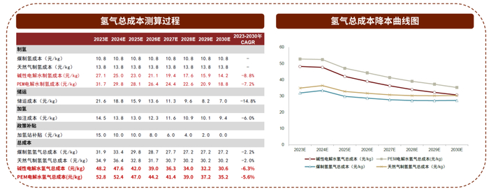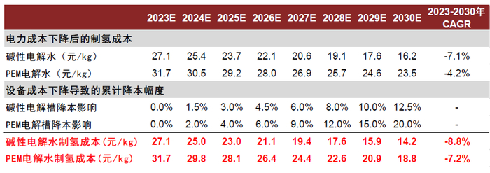 图表7:我们预计至2030年绿氢成本有望降至30.6元/kg,23-30年CAGR达-6%