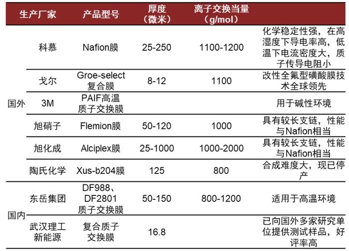 图表30:国内外主要质子交换膜厂商和产品