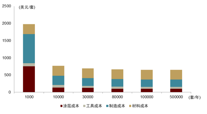 ►规模化:据美国能源部测算,随着金属双极板生产规模由1000套/年增长到10000套/年,成本会显著降低(绝大部分降幅来自涂层成本和制造成本),生产规模达到10000套/年以后,规模化效应不再显著。