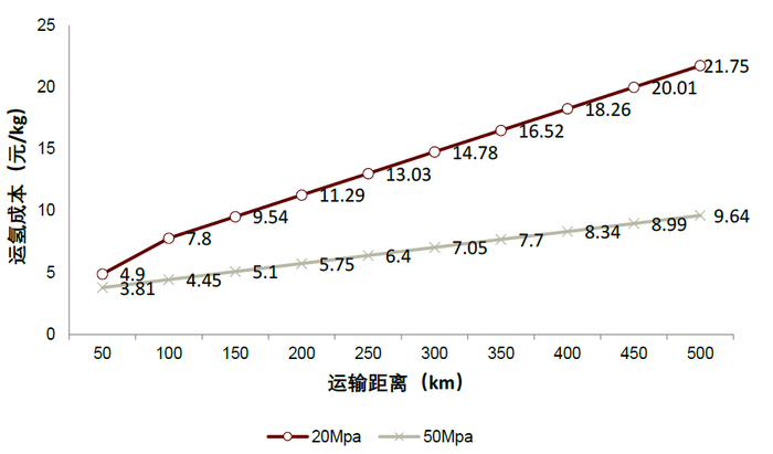 图表20:不同运输距离下20Mpa和50Mpa单位运氢成本(15%毛利)