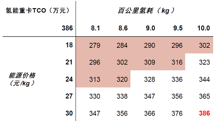 图表4:氢能重卡TCO敏感性分析——氢价&氢耗