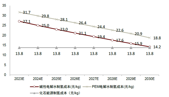 图表18:2023E-2030E电解水制氢成本预测