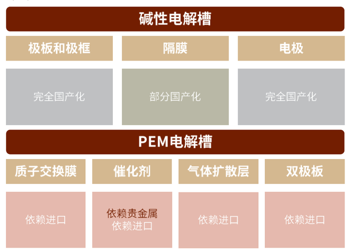 图表15:碱性电解槽基本国产化,PEM电解槽核心部件依赖进口