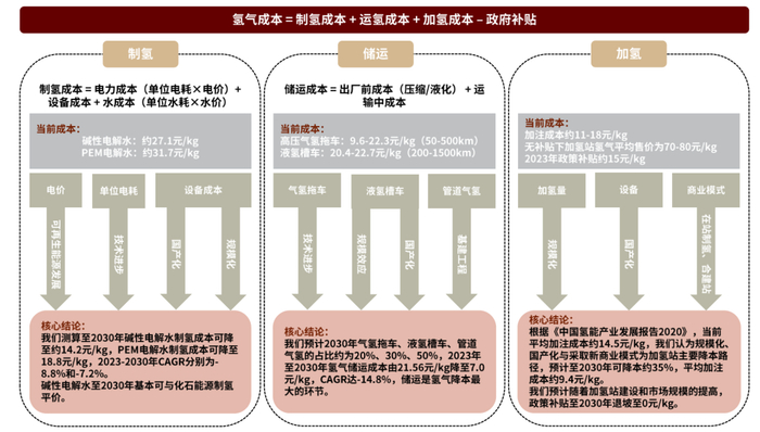 核心结论:我们认为绿氢总成本在2030年左右才有可能与化石能源制氢成本实现平价,2030年之前氢气的降本主要依靠传统化石能源制氢+储运环节降本实现。