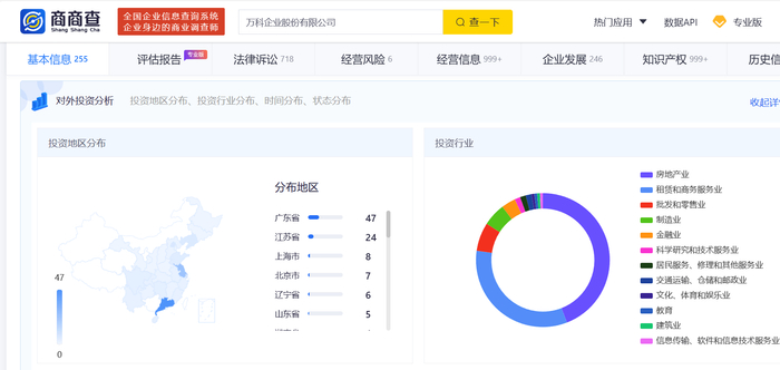 对外投资信息145条,其中投资行业以房地产业,租赁和商务服务业两个行业为主,投资地区主要分布在广东省和江苏省。