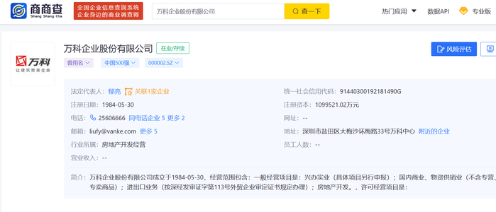 据“商商查”官网介绍,万科企业股份有限公司成立于1984年,法定代表人为郁亮,注册资本:1099521.02万元。经营范围包含兴办实业(具体项目另行申报);国内商业、物资供销业(不含专营、专控、专卖商品);进出口业务(按深经发审证字第113号外贸企业审定证书规定办理);房地产开发等
