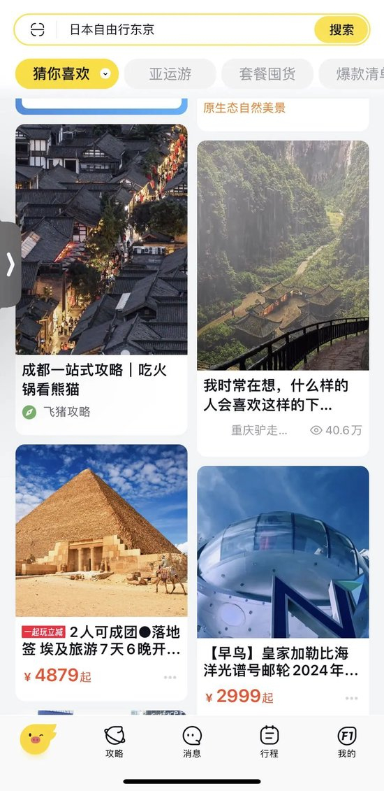 而相比携程首页更多的达人分享,飞猪也提供大量攻略和旅游内容,但首页信息流更偏向PGC内容,或是精品旅游路线推荐,或是某个旅游专营店拍摄的美景短视频。