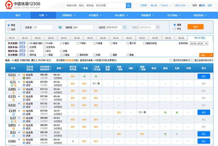 中新财经13日下午登录12306官网查询发现,9月27日,由北京出发到杭州、武汉、南京、西安等地部分车次车票已经售罄。