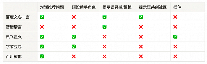 开放注册的 5 款产品都是 chatbot 形式,也都加入了不同程度的提示语引导、使用场景提示。有的是在对话中推荐问题,有的预设了助手角色。有的做得更深入一些,制作了提示语模板、社区或插件,能隐隐约约看到搭建生态的野心,向用户和开发者创造力借智,但目前都处于较为初期的阶段。