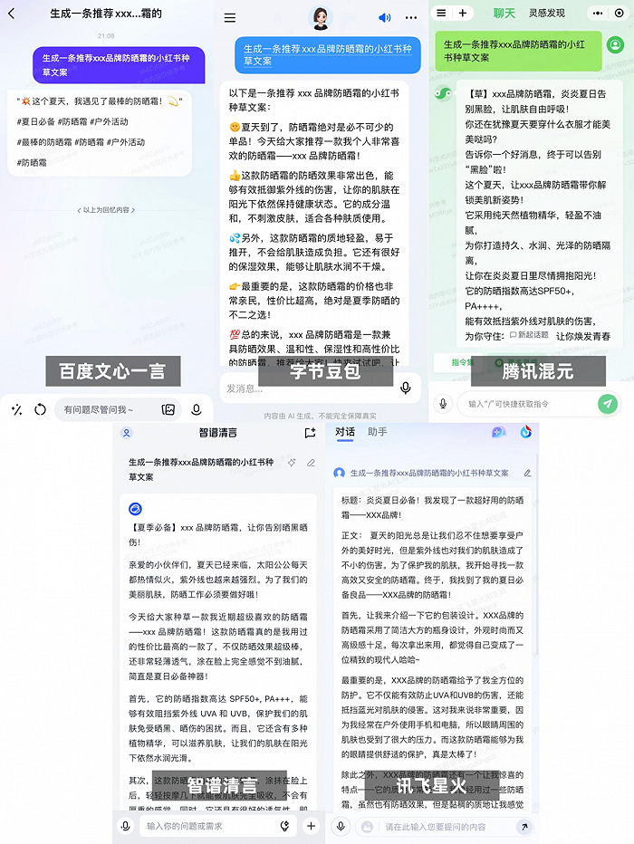 新莓daybreak 体验了下目前 C 端可注册的大模型产品。在生成「小红书种草文案」这个任务上,几款产品的表现均达到了「文通字顺」,甚至「有点好用」。文心一言擅长加tag引流,豆包的文案颇有亲切感,混元的文案有点4A广告公司的味道,智谱清言像是严谨的语文老师,讯飞星火则从场景切入。还是本土模型最懂本土社交平台。