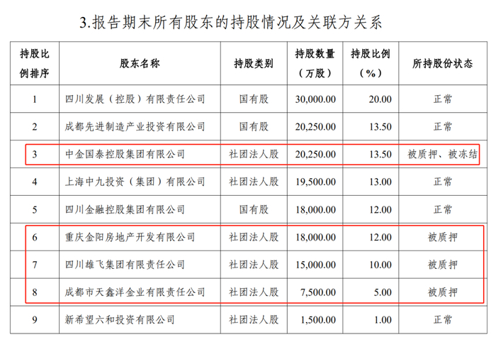 一方面是地方国资背景股东在加码,另一方面却是多家股东所持股权“被质押”。根据国宝人寿2023年第二季度偿付能力报告,中金国泰控股所持股份为“被质押、被冻结”;重庆金阳房地产、四川雄飞集团、成都市天鑫洋金业三家股东所持股份均为“被质押”。