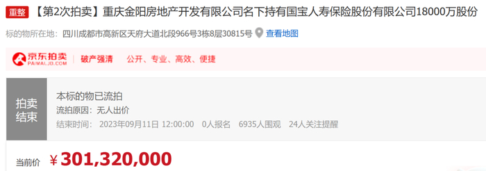 《国际金融报》记者在京东司法拍卖平台发现,重庆金阳房地产分别于今年7月、9月连续两次拍卖所持国宝人寿1.8亿股股权,起拍价分别为3.348亿元、3.0132亿元,但两次均以流拍告终。根据京东法拍对外披露的信息,金阳房地产公司于2020年申请破产重整,截至2019年底总资产约16.7亿元,总负债24.14亿元。四川雄飞集团也已于2021年9月向法院申请破产重组。
