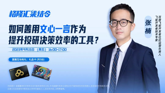 本场直播还设置了互动有礼环节,欢迎大家踊跃提问和参与讨论。我们将针对大家关心的问题和疑惑进行解答,并邀请大家现学现用设置prompt来解决相关问题,共同探讨如何更好地运用文心一言来提升投研决策效率。欢迎大家扫码下方海报一键预约直播,准时互动收看: