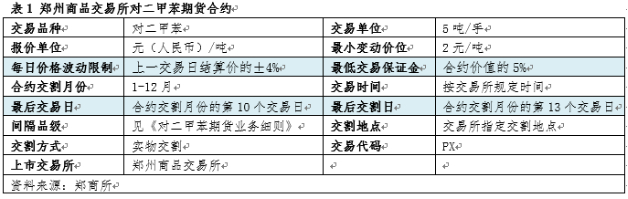 新华财经北京9月14日电 对二甲苯(PX)是重要的聚酯生产原料,广泛应用于化纤、建筑、电子等国民经济的各个领域。对二甲苯期货和期权将于9月15日在郑州商品交易所正式挂牌上市。期货的上市对于产品及行业角度而言,能够为PX现货市场提供更透明的价格发现工具,提升行业的价格透明度,同时也将影响和改变对二甲苯的现货价格的驱动。