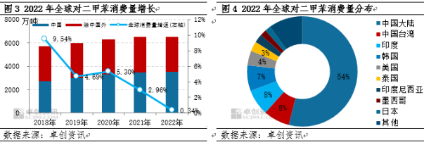 近五年全球对二甲苯消费量逐年提升,年均复合增长率为4.52%,至2022 年全球对二甲苯总消费量达到6515.2 万吨。从消费规模和结构来看,中国是PX的主要消费区域。以2022年的数据分析来看,中国消费占全球总消费的比例为54%,其他地区与中国的消费量相比,所占的比例均较小。