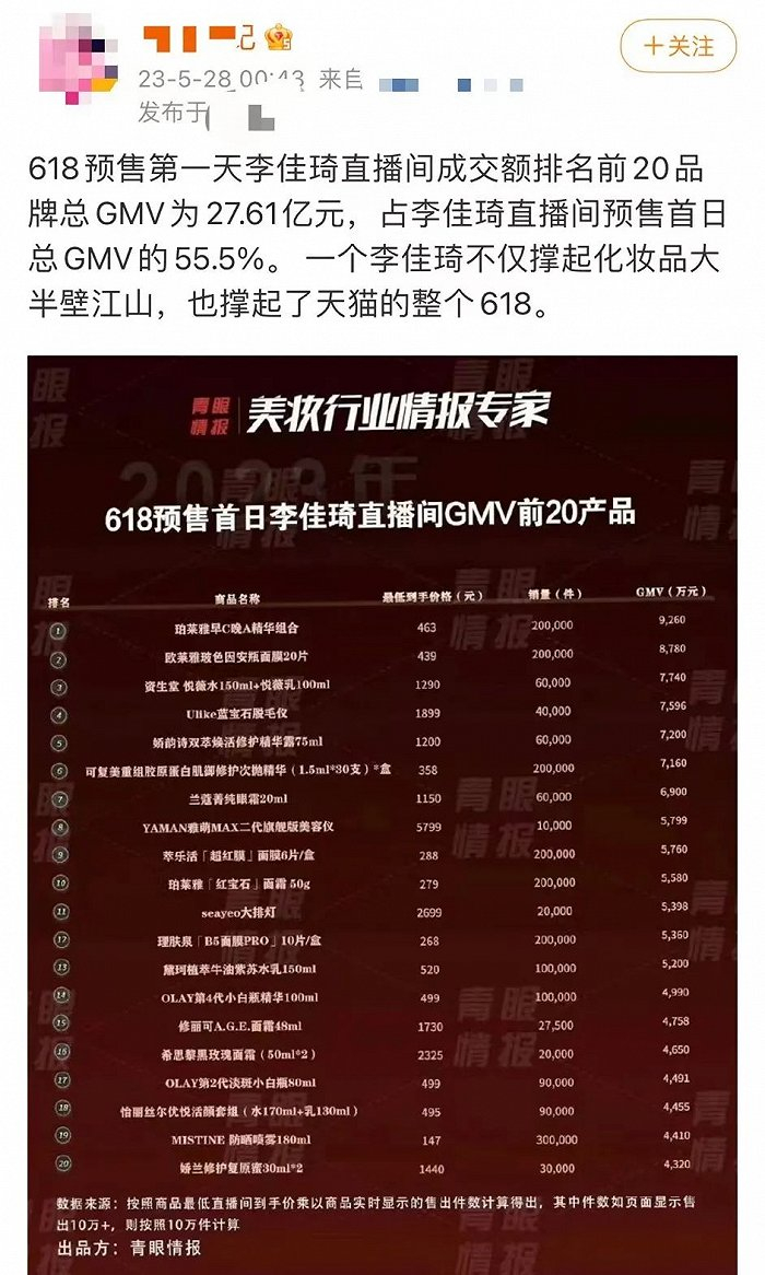 今年618预售首日,据淘宝直播数据,李佳琦直播间的GMV达到了49.77亿元,同比增长21.4%,而当日天猫618美妆类预售GMV一共才85.9亿元,李佳琦以一己之力贡献了其中超过一半的销量。