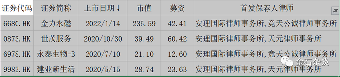 2020年还担任了百胜、中通快递的保荐律所,2021年虽然只有3家,但担任了小鹏、云音乐的保荐律所,2022年还有中国中免、腾讯音乐,2023年最大的公司就是药师帮了。
