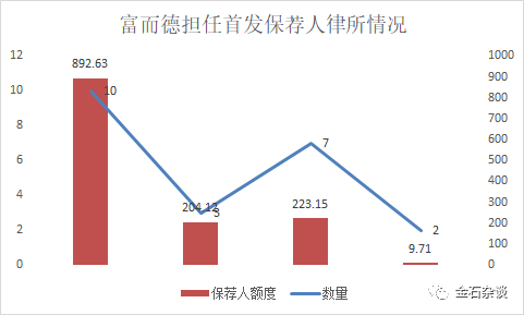 富而德前几年的数据还是非常优秀的,担任保荐律师募资额度高达892亿,不过2021年、2022年已经膝盖斩,现在进入了脚底斩了,担任律所的新股募资额度只有不到10亿。