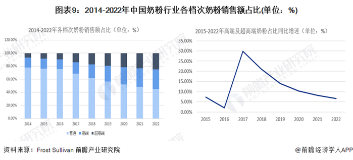 据Frost & Sullivan数据,2014-2022年,中国高端和超高端奶粉在奶粉中的销售额占比逐年提高,且增速较快,但近几年来,中国高端和超高端奶粉在奶粉中的销售额占比增速有所下降,但未来仍将保持增长态势。