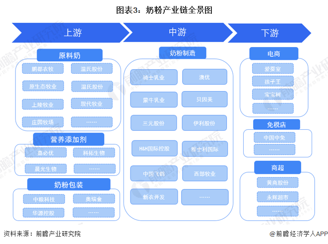 目前,在中国奶粉产业链中,上游以原料奶的供应商为主,下游以商超和电商为主。在中游奶粉行业中,主要有中国飞鹤、贝因美、澳优、西部牧业、H&H国际控股、伊利股份、光明乳业、三元股份、雅士利国际、蒙牛乳业、骑士乳业、新农开发等企业。