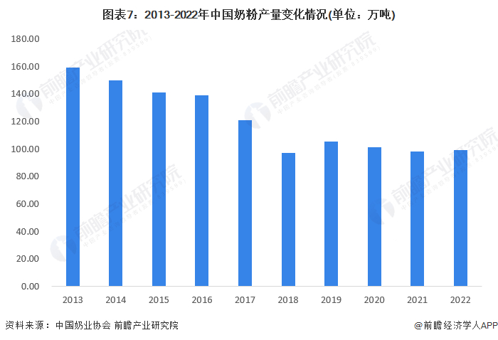 2013-2022年,中国奶粉行业产量整体呈下降趋势。2022年中国奶粉产量与2021年基本持平,奶粉产量未超过100万吨。