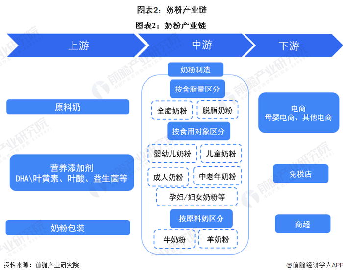 从整体来看,奶粉产业链较为简朴,所涉及的领域并不多。产业可分为上游的生产原材料:原料奶和营养添加剂,以及包装环节;中游奶粉制造行业中又可分为根据奶粉的不同食用群体、奶粉性质等分为婴幼儿奶粉、成人奶粉、儿童奶粉、中老年奶粉、羊奶粉、有机奶粉、孕妇/妇女奶粉等细分领域;生产出来的奶粉则向电商、免税店和商超等。
