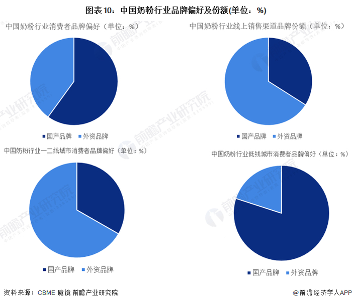 据CBME和魔镜数据,目前,整体看来,中国奶粉行业中国产品牌更具有优势,占据更高的品牌热度;从线上来看,外资品牌更具有竞争优势,占据了更多的市场份额;在一二线城市中,外资品牌更具有优势,占据了更高的品牌热度;从在低线城市中,国产品牌奶粉更具有竞争优势,占据了更好的品牌热度。