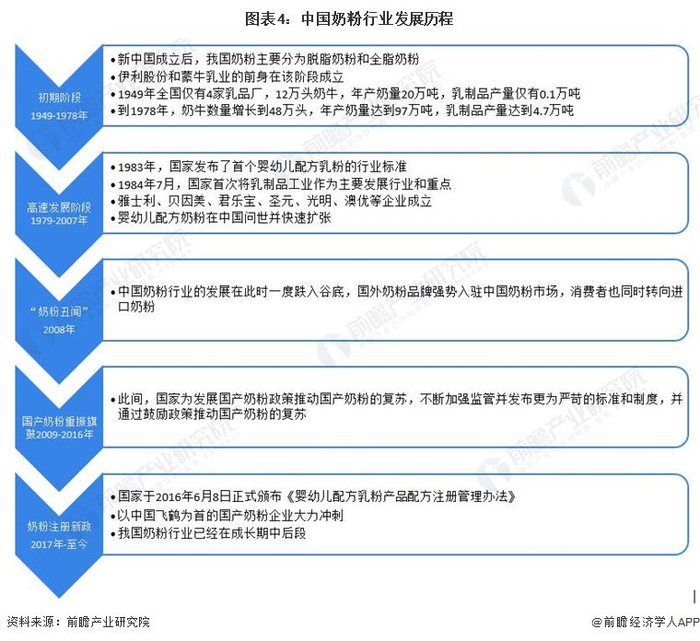 中国奶粉行业从最早仅可分为全脂奶粉和脱脂奶粉,到2008年经历“奶粉丑闻”事件后,消费者对国产奶粉的信心严重下降,进口奶粉成为主流;再到国产奶粉重新崛起,以中国飞鹤为首的企业奶粉营收快速增长。目前,我国奶粉行业已然步入成长期中后段,行业大企业开始利用自身优势进一步与中小型企业拉大差距且领跑行业,市场竞争白热化并逐步趋于饱和。