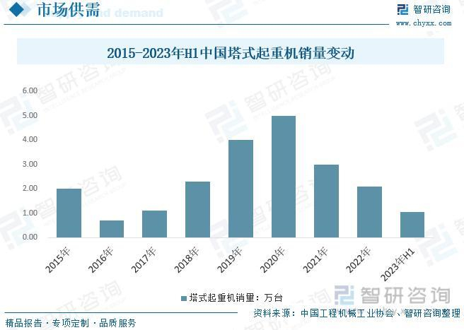 我国塔式起重机销量变动情况而言,2016年以来我国塔式起重机销量快速增长,一度在2020年达5万台,需求和政策影响,我国塔式起重机2022年销量仅为2.1万台,2023年来看,我国塔式起重机需求仍居低位水平,数据显示2023年上半年我国塔式起重机销量约1.04万台,国内销量占比超八成。
