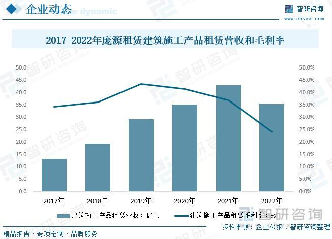 庞源租赁是世界500强企业陕西煤业化工集团有限公司旗下上市公司-陕西建设机械股份有限公司最大的全资核心骨干子企业,庞源租赁对外租赁的起重机械主要包括塔式起重机、施工升降机、履带式起重机、架桥机等,是国内规模最大、设备种类最为齐备的建筑起重机械经营租赁企业之一,可以满足不同工程的施工要求,与同行业竞争对手相比具有明显的规模优势。就其经营现状而言,2021年及以前随着国内房地产需求和企业经营策略推动,庞源租赁整体租赁营收持续增长,随着国内房地产需求不振,2022年整体建筑施工产品租赁营收为35.3亿元,较2021年下降18%左右,毛利率水平也达近年来最低值24.24%。