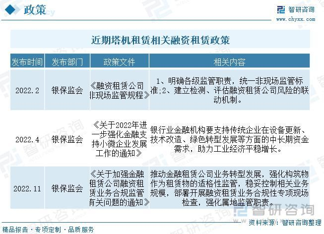 融资租赁配套法律法规持续完善,乘融资租赁东风,工程设备租赁将维持高速发展。2020 年以来,随着国内融资租赁监管标准不断提高,行业步入转型优化期。2021年5月起,国资委、央行、银保监会陆续发布文件,规范融资租赁行业发展,要求回归业务本源,提升服务实业能力,多个省市在“十四五”金融发展规划中也对融资租赁行业提出聚焦实体经济的发展规划。2022 年,稳增长压力下央行、银保监会出台了多项金融支持实体经济文件,融资租赁业作为重要的非银金融部门响应号召,积极阔表,塔机等工程租赁业有望乘其东风,维持高速发展。