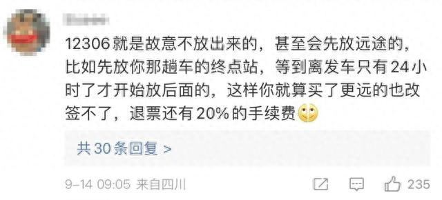 也有网友称“可能被其他抢票软件占坑位了,不是有预约功能吗,咱们手速怎么比得过系统”,“12306就是故意不放出来的,甚至会先放远途的,比如先放你那趟车的终点站,等到离发车只有24小时了才开始放后面的,这样你就算买了更远的也改签不了,退票还有20%的手续费”。