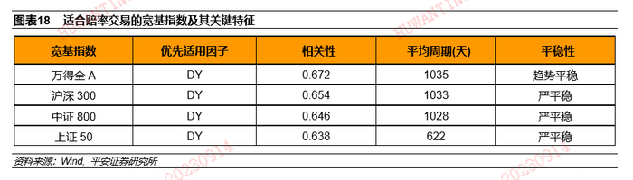 结合相关性检验、周期分析、平稳性检验结果,上证50、沪深300、中证800、万得全A适合作为赔率交易标的,适合的赔率因子均为股息率DY。相关性检验衡量了交易信号的有效性,周期长度决定了赔率交易的频率和等待盈利时间长短,平稳性检验结果验证了估值中枢的长期稳定,并提示了部分指数估值中枢的线性变动趋势。