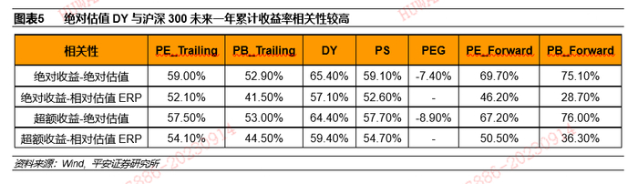 对比不同赔率因子,沪深300未来一年累计收益率与绝对估值指标相关性更高,其中股息率DY相关性最高。目前使用的预期估值因子与未来收益相关性无明显提升,下文研究不再讨论。使用2007年7月以来沪深300数据测算各赔率因子与沪深300未来一年累计收益率、未来一年累计超额收益(基准为万得中长期纯债型基金指数)的相关性,结果显示股息率DY的相关性最高。由于预期PE、PB数据区间较短,我们使用相同区间历史PE、PB重新测算,结果显示2013年以来的历史PE、PB与未来一年收益率之间的相关性分别为73.0%、78.4%,高于对应预期因子的69.7%、75.1%。PE-Forward、PB-Forward对未来收益预测无明显提升效果,后续研究将不再单独讨论预期因子。除DY外各赔率指标相关性使用赔率因子倒数与未来收益计算,下同。
