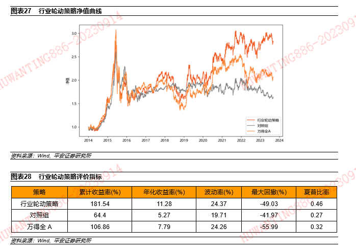 对照组:分别使用31个申万一级行业及其PE计算赔率信号,每期选取赔率较高的3个行业等权构建投资组合。