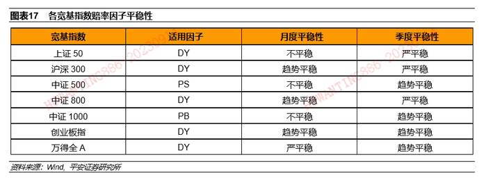 根据检验,季度水平上指数平稳性显著提高,均能通过平稳性检验,中证500、中证1000、创业板指、万得全A为趋势平稳,估值中枢可能呈现缓慢、线性变化。
